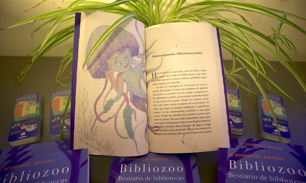 Si la escritura del libro fue bastante rodada, el tiempo de concreción de la publicación resultó, en cambio, extraordinariamente largo. Carl Jung hablaba, entre sus muchas aportaciones en el campo de la psicología, del concepto Kairós: el tiempo de gestación psíquica para cada transformación personal. Cada evento significativo tiene su propio tiempo de maduración. Creo que esto es lo que sucedió también con Bibliozoo: bestiario de bibliotecas. Durante muchos años permaneció archivado en una carpeta de mi ordenador. Yo había visualizado la edición de la obra, casi desde un principio, acompañada de ilustraciones, mas no terminaba de dar con la persona que me secundara en el proyecto. Parecía que el Universo retrasase la publicación hasta que esa persona apareciera… Finalmente, ha sido la artista e ilustradora Naza del Rosal, con su precioso imaginario de carácter simbólico en torno a la Naturaleza y el mundo animal, quien ha iluminado con su arte las páginas del libro. En total, veintisiete ilustraciones a todo color, a razón de una por cada ficción o relato; más la sensacional cubierta.